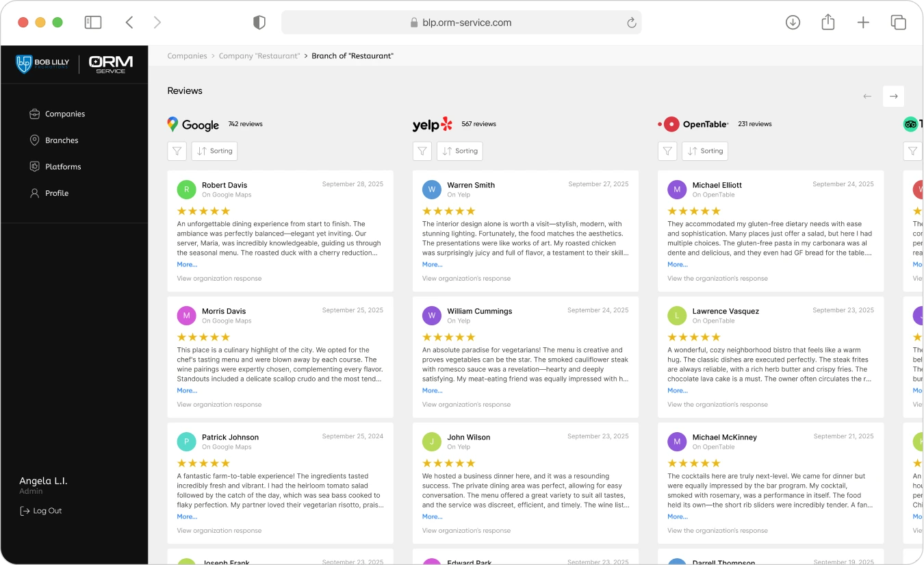 Reviews from Google maps, Yelp, OpenTable, and other platforms are gathered in one dashboard.
