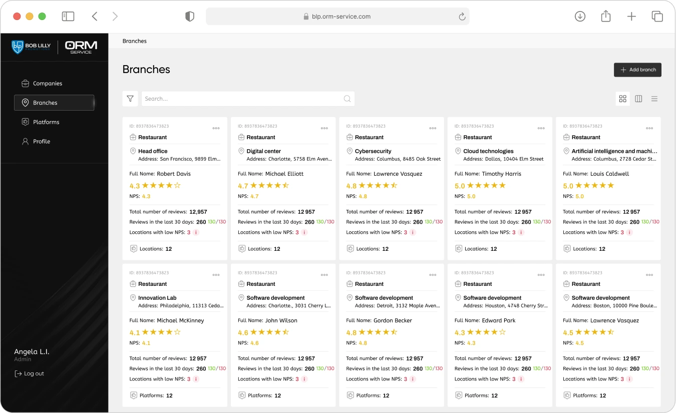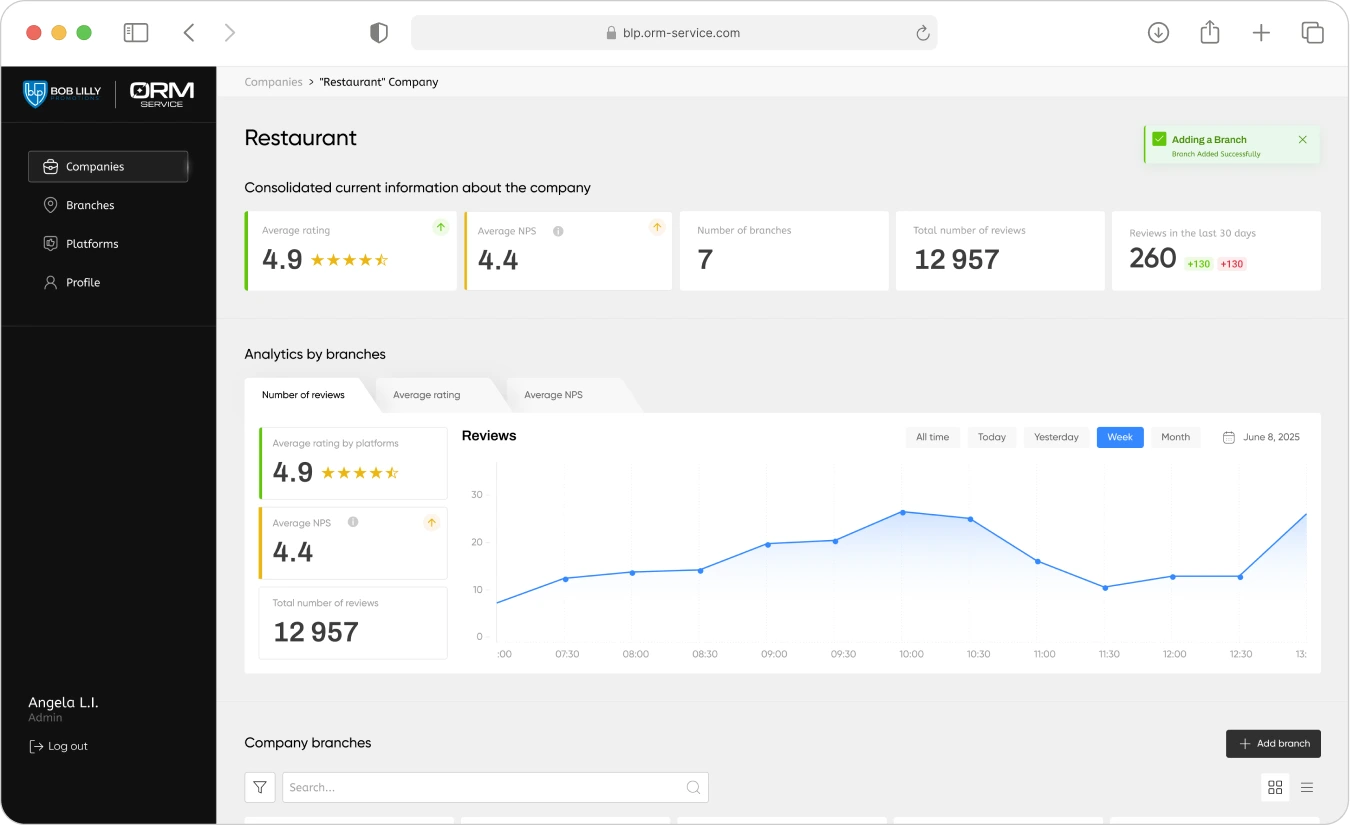 Compare branches by rating and reviews. Problem areas are automatically highlighted.